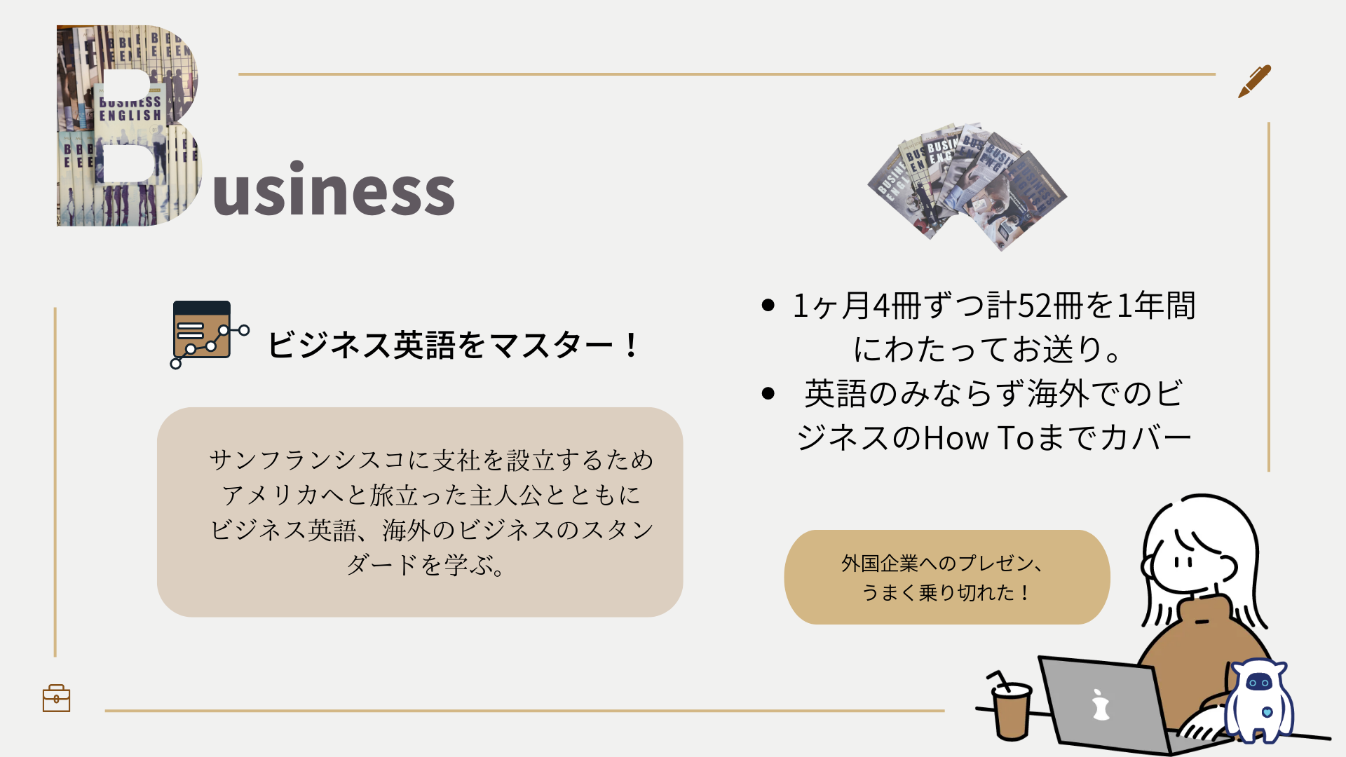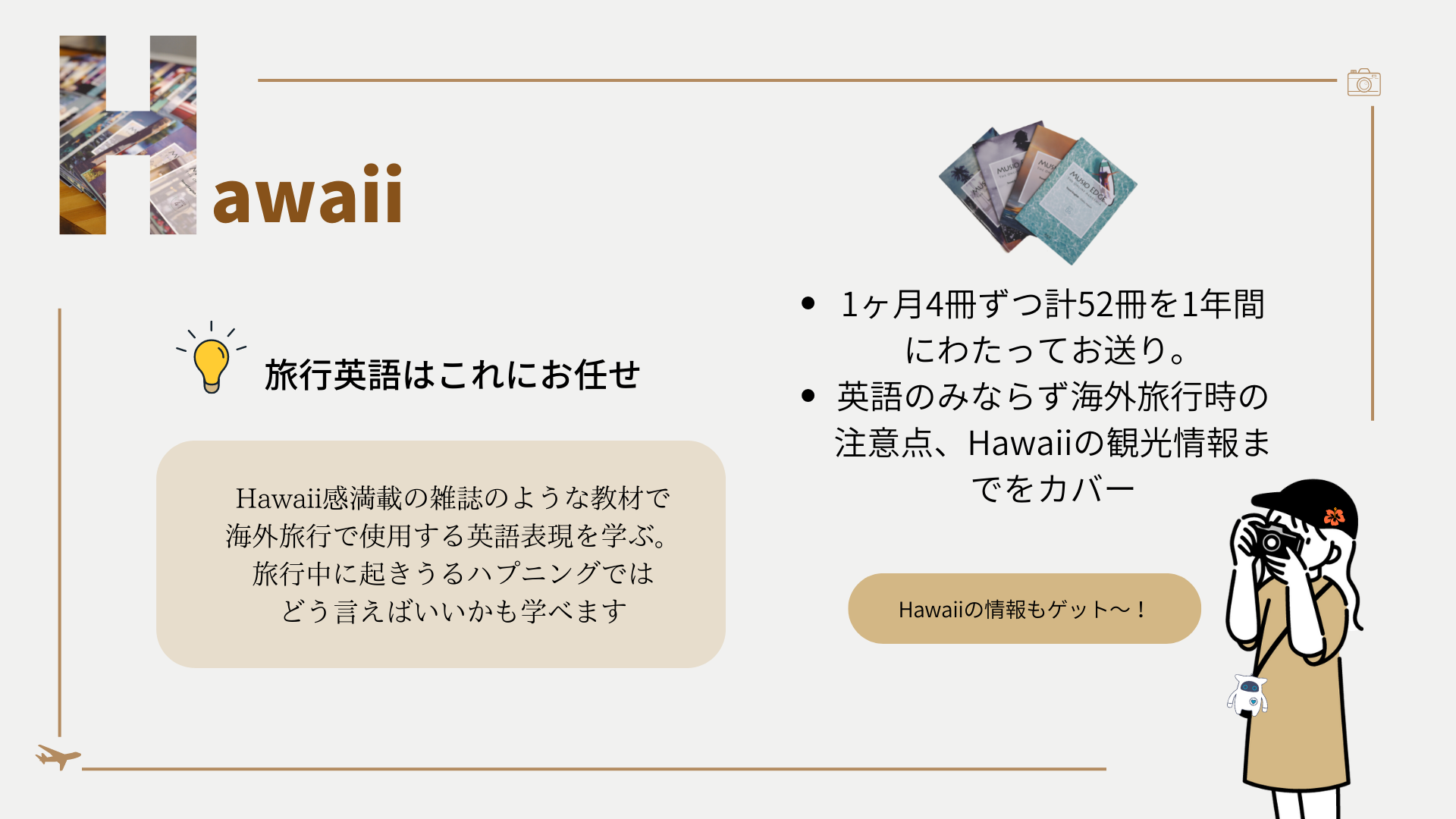 - 1ヶ月に4冊ずつ送られてくるオリジナル教材(Business / Hawaii)