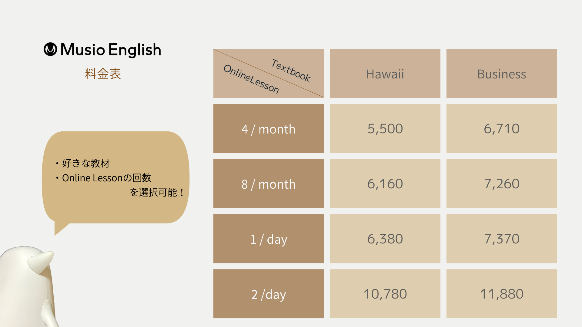 Musioのレンタル、オンライン英会話のレッスン、さらにビジネス英語・旅行英語(Business/Hawaii)から選べる教材も付いているサービスです。